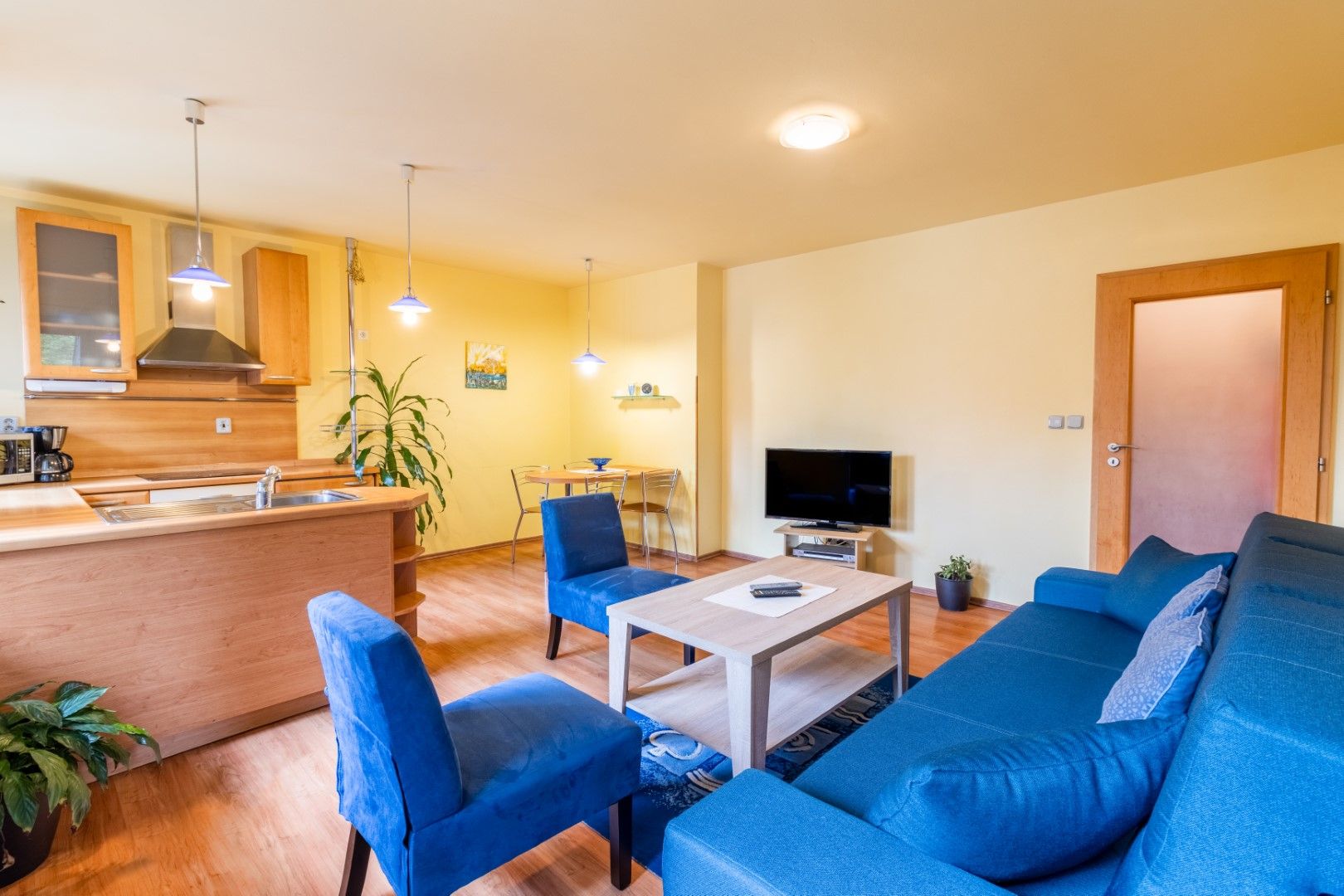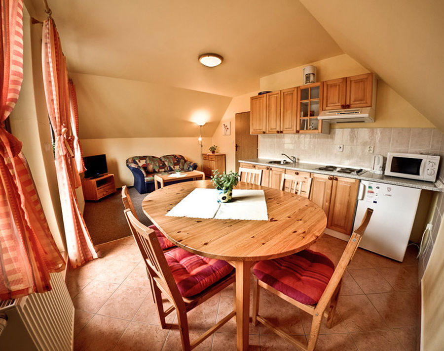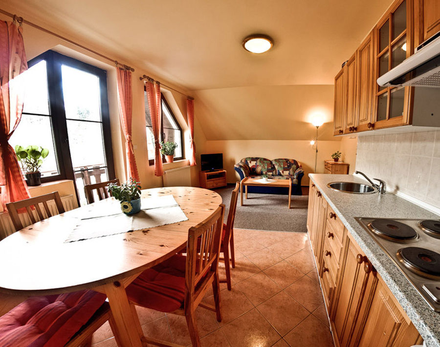 1x pokoj, 3x lůžko, kuchyň, sprcha, WC, TV-SAT, balkon, ski-box, parkoviště, garáž.