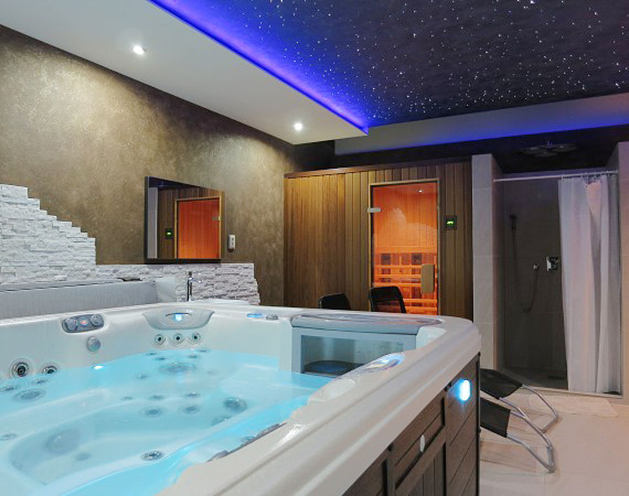 Najdete tu i malé stylové wellness centrum s luxusní vířivkou, infrasaunou a tropickou dešťovou sprchou. Vstup za poplatek.