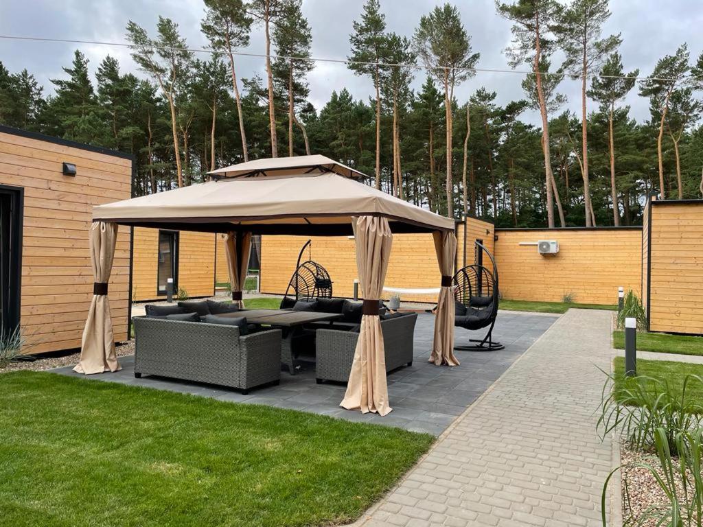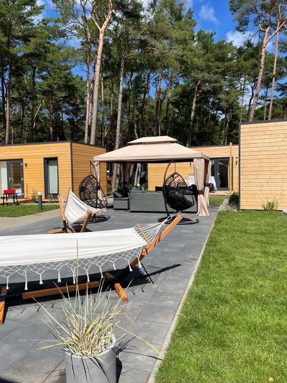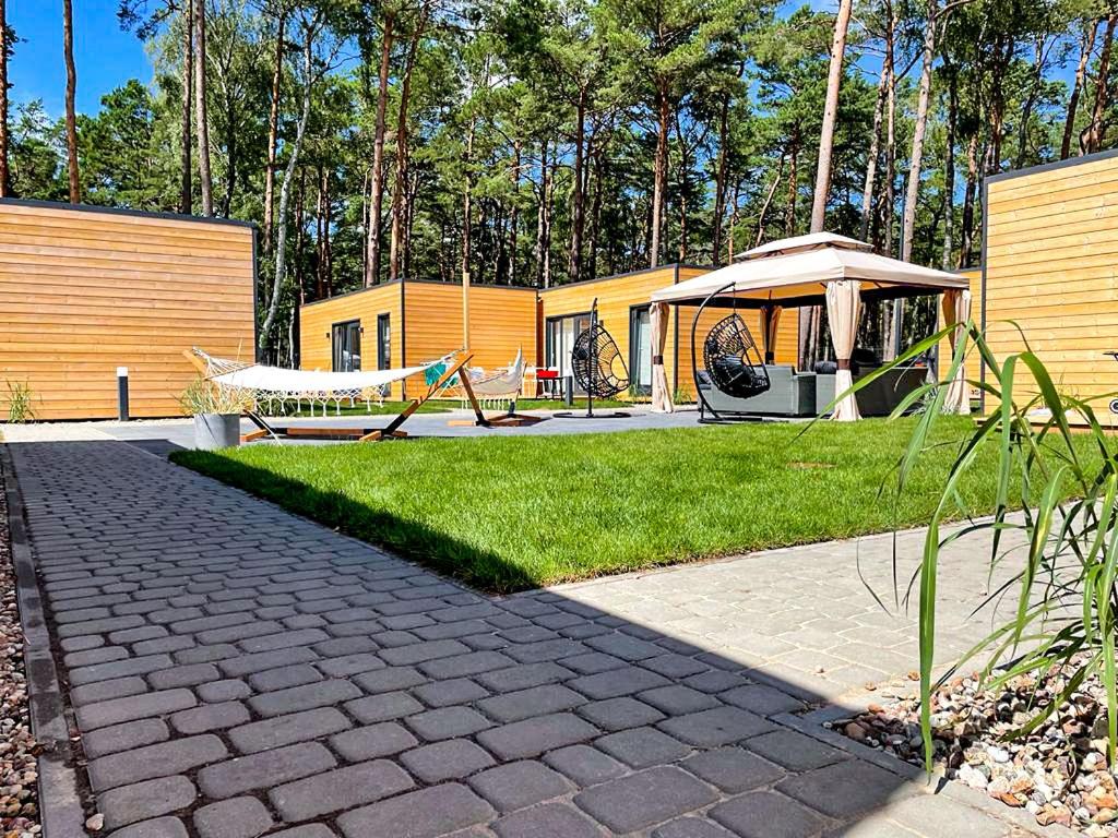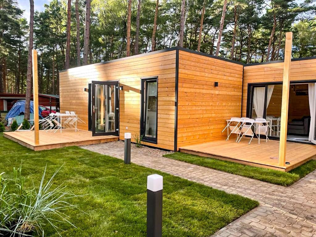 Domy se skládají ze dvou ložnic (hlavní a dětské), obývacího pokoje s kuchyňským koutem a koupelny. Plocha domu je 35 m2. Každý dům má terasu 15 m2. Vybavení domu: ručníky, ložní prádlo, kuchyňský kout (rychlovarná konvice, indukční varná deska, lednička, nádobí, kuchyňské potřeby), šatní skříně, ramínka na šaty, vysoká stolička a dětská postýlka, prostor k sezení, TV, knihy, zahradní nábytek na terasu. Ke každému domu jsou navíc zástěny a dvě lehátka. Pro hosty s auty je k dispozici bezplatné uzavřené parkoviště. Ke každé chatě náleží jedno parkovací místo.
