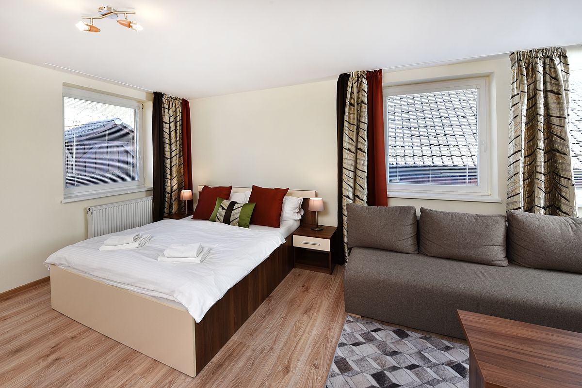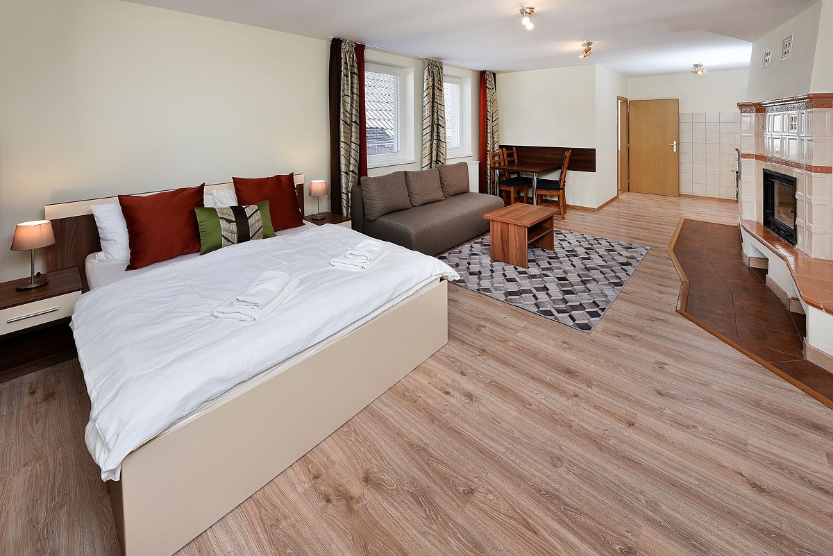 Studia s kuchyňským koutem (velikost obytné plochy 25 – 30 m). Ubytování ve studiu je vhodné pro max. 4 osoby. Studio se skládá z předsíně, koupelny se sprchovým koutem a WC, dále s místnosti s 2 lůžky a s pohovkou, konferenčním stolem, TVSAT, rádiem, kuchyňským koutem se základním vybavením, sporákem a ledničkou.