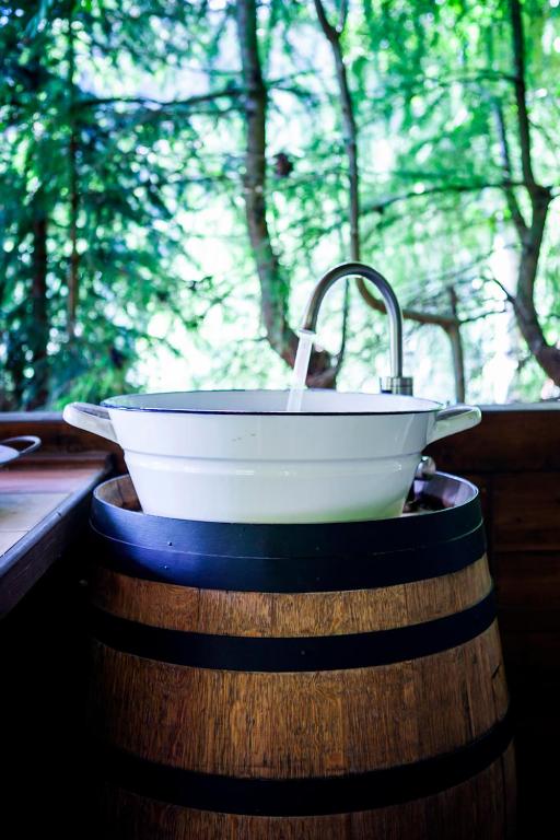 Na místě není restaurace, ale hosté mají k dispozici plně vybavené kuchyně. K tomu funguje samoobslužný bar s lokálním pivem, vínem, potravinami a snídaňovými doplňky, otevřený 24/7.
