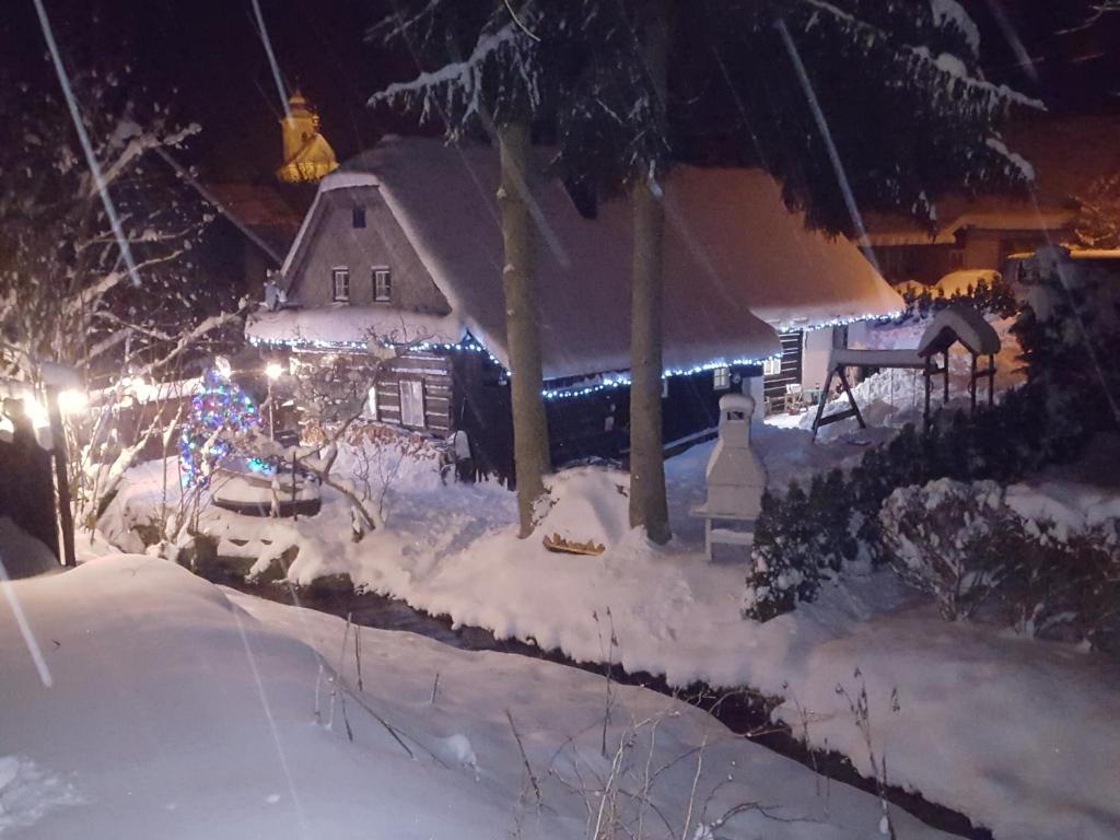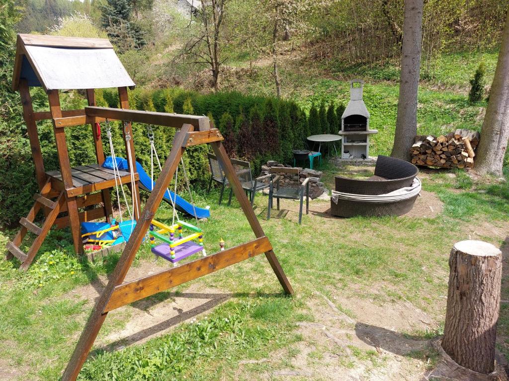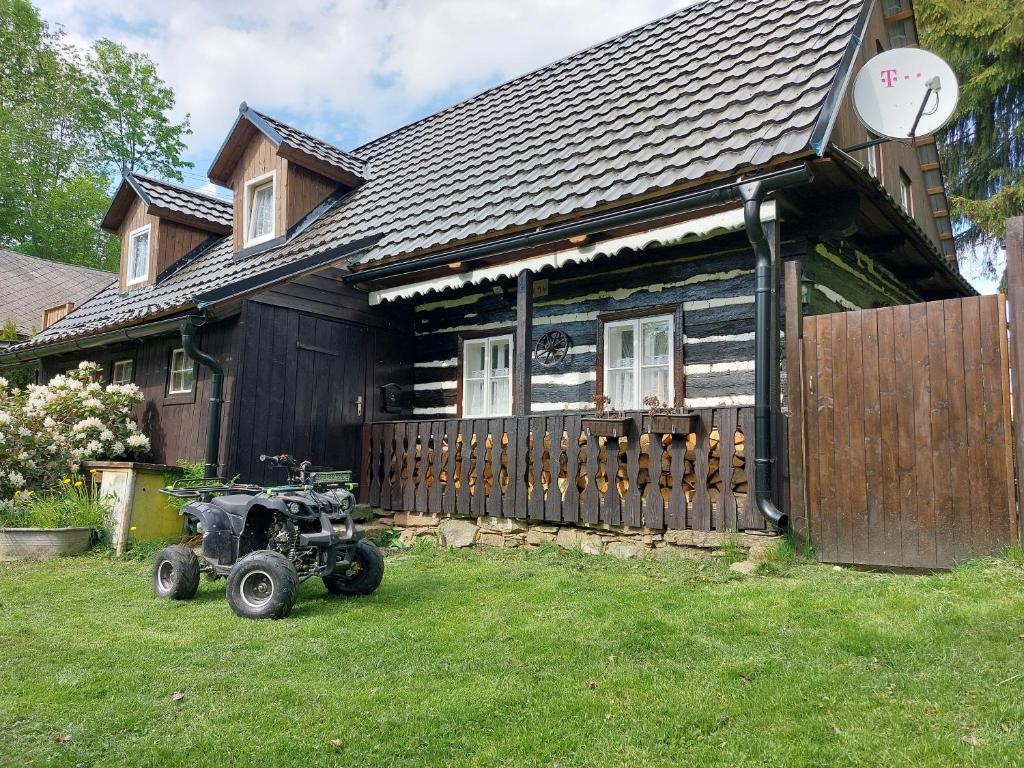 Historická chalupa prošla rekonstrukcí i zateplením, aby byla útulná po celý rok. V přízemí je předsíň, dvě ložnice, koupelna a plnější pokoj s krbem. Horní patro nabízí další ložnici, kuchyňku, koupelnu a přístup do podkroví – ideální spaní pro děti. Exteriér zahrnuje oplocenou část zahrady, venkovní posezení, gril, ohniště, dětské hřiště, bazén/celá zahrada cca 300 m², potůček pro ochlazení a parkování přímo u domu. Pejsci vítáni (za poplatek). Služby: Wi‑Fi, TV, DVD/rádio, lyžárna/kolárna, dětské hračky.